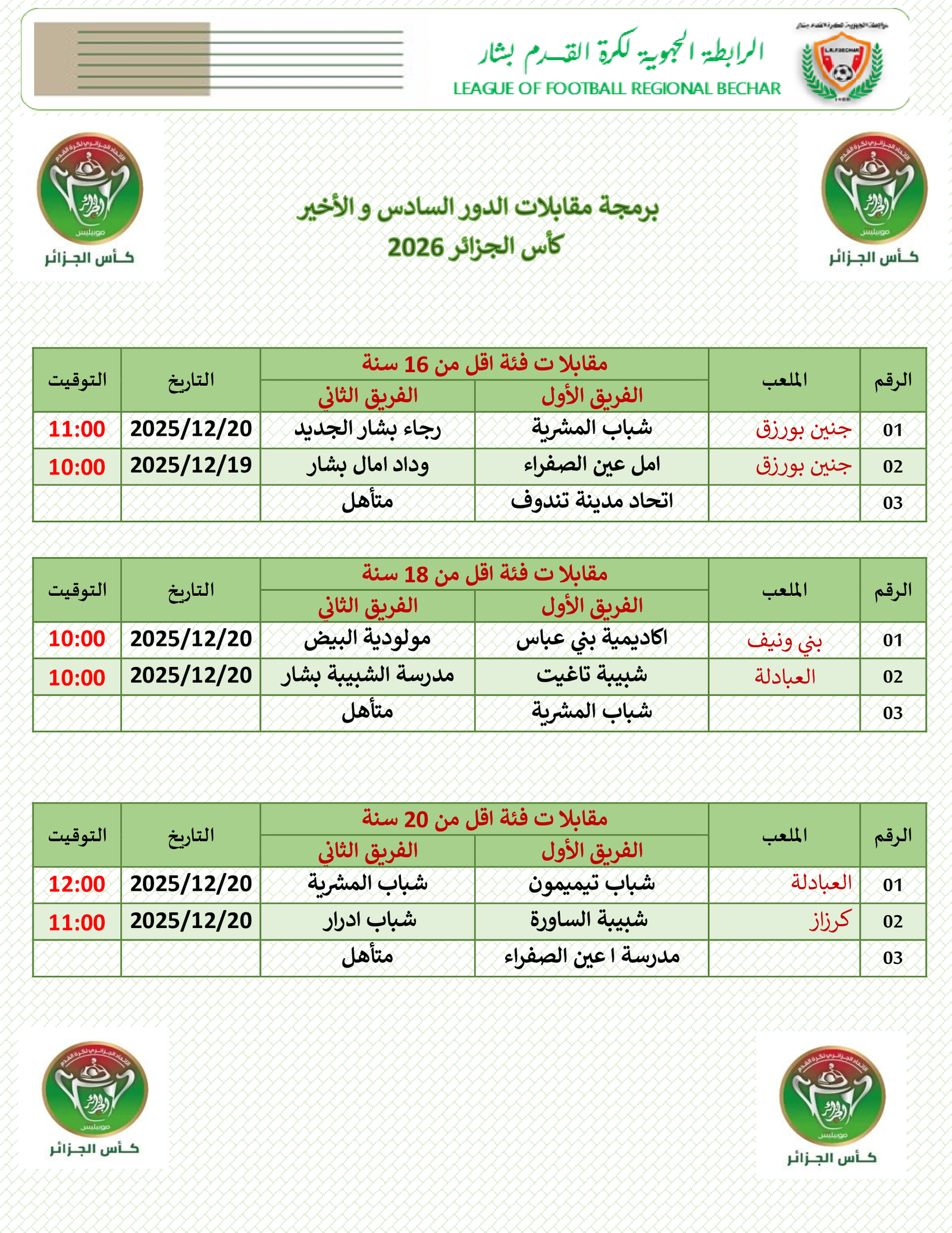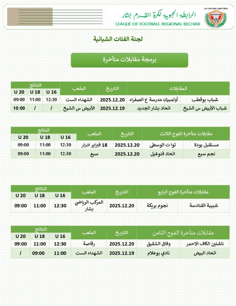 نظرًا لعدم استقرار عمل المنصات الرقمية التابعة للاتحاد الجزائري لكرة القدم، يُطلب من الأندية تحميل قوائم اللاعبين عبر منصة ورقة المقابلة الإلكترونية قبل 24 ساعة من موعد المباراة، وذلك لتمكين الحكام من التحقق من هوية اللاعبين وتفادي أي عراقيل قد تؤثر على السير الحسن للمقابلاتكما نُعلم السادة الحكام والأندية بضرورة استخدام ورقة المقابلة الورقية في…
