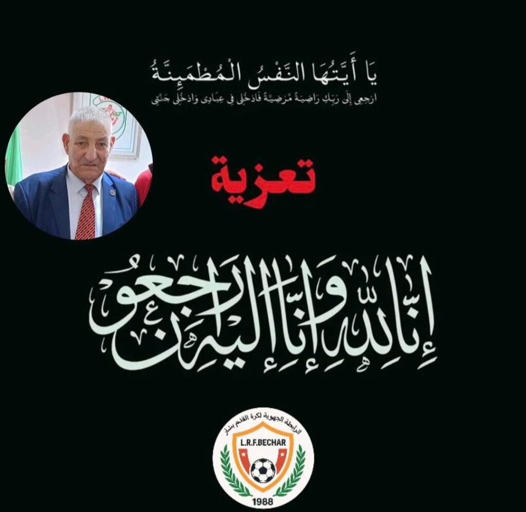 و على اثر هذا المصاب الجلل، يتقدم رئيس الرابطة الجهوية لكرة القدم بشار وأعضاء مكتبه و حكام الرابطة بخالص التعازي وأسمى عبارات المواساة، سائلين المولى عز وجل أن يتغمده بواسع رحمته، ويسكنه فسيح جناته ويلهم أهله وذويه جميل الصبر و السلوان